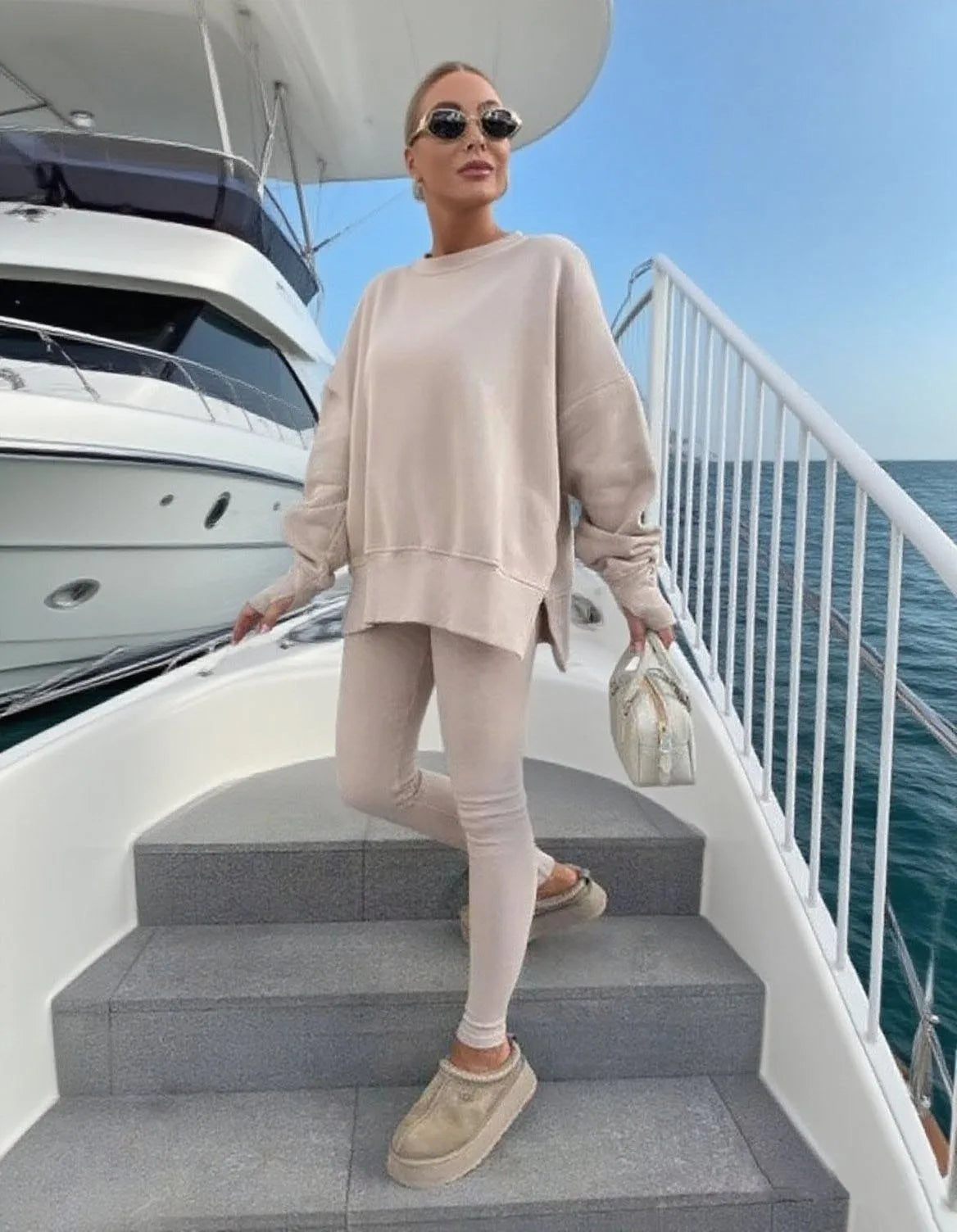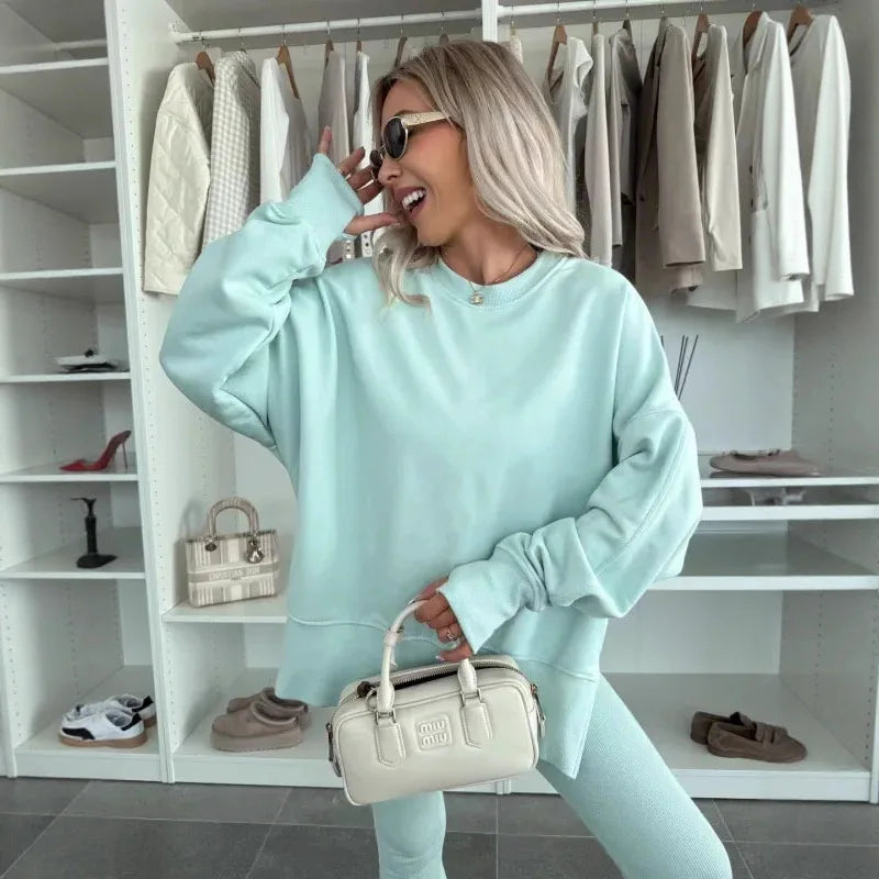 A set designed for days when comfort and style go hand in hand. The dropped-shoulder sweatshirt brings a light and relaxed feel, while the loose pants complete a modern casual look. Perfect for autumn moments of leisure when you seek coziness without giving up elegance.